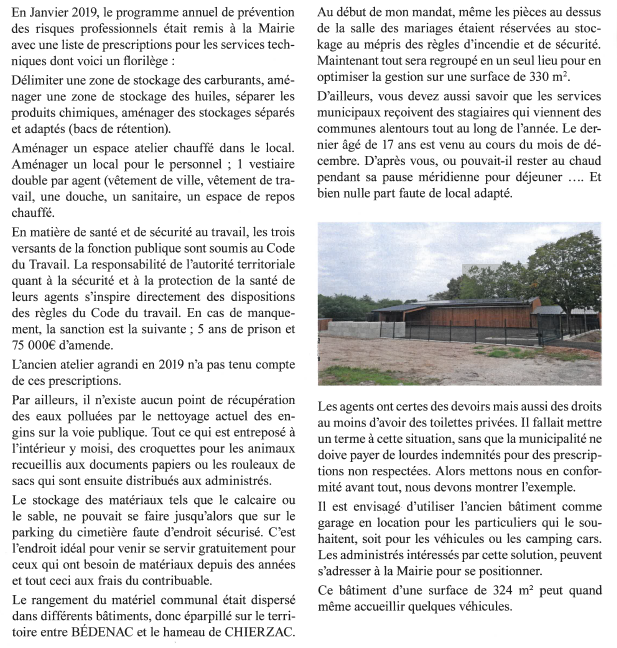 Vous pouvez maintenant regarder impasse de la Gare à BÉDENAC, un bâtiment qui se dresse, conséquence d’un investissement municipal devenu nécessaire. Il s’agit du nouvel atelier, en remplacement de l’ancien contrôlé en 2018 par l’inspection du travail.
